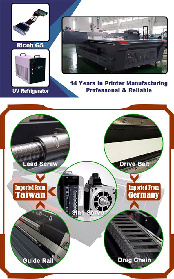 2, எங்கள் அச்சுப்பொறிகளின் அச்சுத் தலைவர்கள் ரிக்கோ GH2220 / G4 / G5. அவை அதிக துல்லியமான மற்றும் வேகமான அச்சு வேகத்தின் தொழில்துறை அச்சுத் தலைவர்கள். ரிக்கோ அச்சுத் தலைவர் உயர் தரமான மற்றும் நீண்ட ஆயுட்காலம் குறித்த நல்ல பெயரை எழுப்புகிறார். எடுத்துக்காட்டாக, ஸ்க்ரூ ராட், கையேடு ரெயில் மற்றும் சர்வோ மோட்டார் ஆகியவை தைவானில் இருந்து வந்தவை, இழுவை சங்கிலி ஜெர்மனியிலிருந்து வந்தது, போர்டு கார்டு மற்றும் மென்பொருள் அமெரிக்காவிலிருந்து வந்தவை.